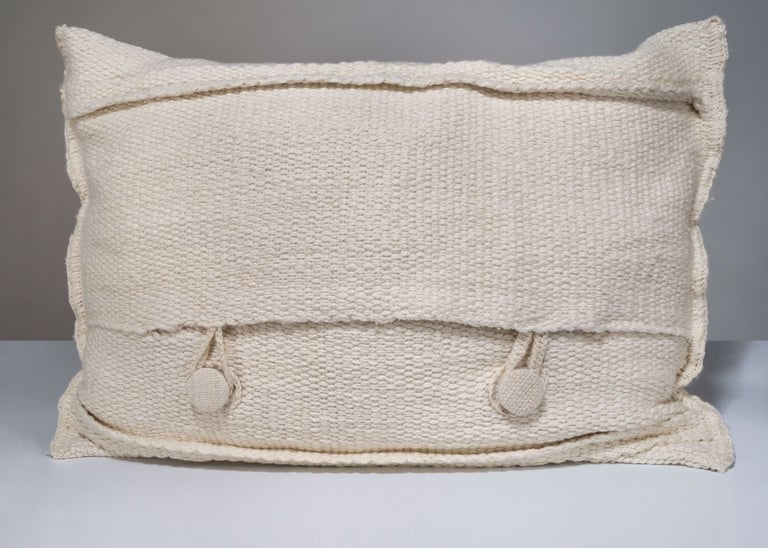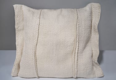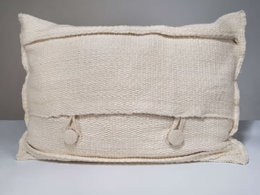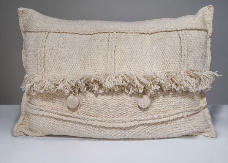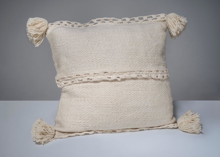 Housse filé et tissé entièrement à la main dans nos ateliers du Sine Saloum. Motif uni structuré. Boutons en métal aluminium recyclé recouverts de tissu ton-sur-ton. Boutonnière au crochet. Finition crochet ajouré, pompons à franges. Dimension 40 x 40 cm