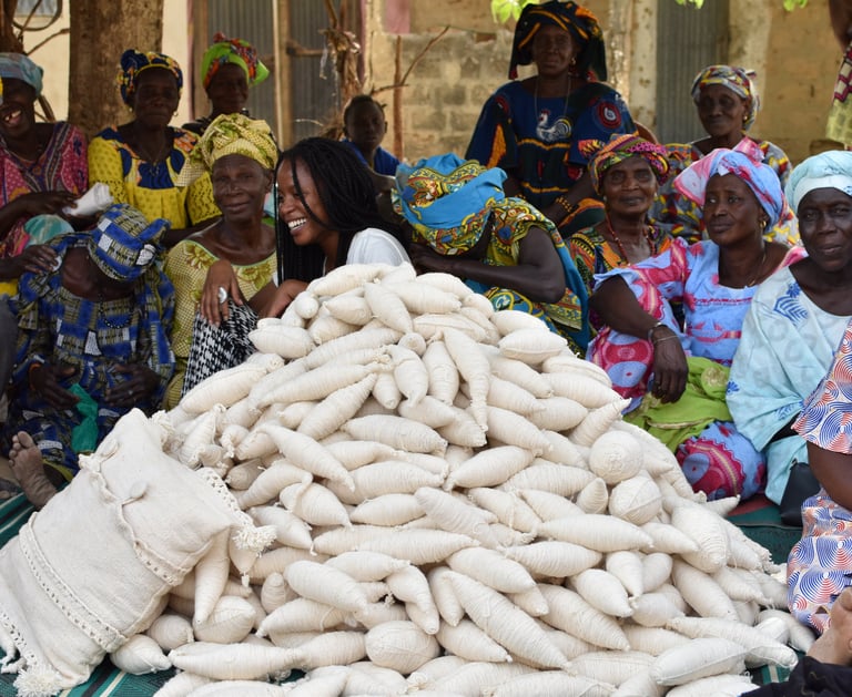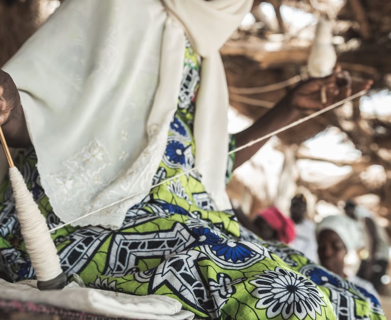 Fin 2020, de retour dans son pays après 12 ans en France, elle sillonne le sud du Sénégal et s’éprend de la tradition de filature du coton pluvial à la main, le Falé. Fatim a souhaité mettre en lumière ce savoir-faire saisissant qui est en voie de disparition, en créant un collectif d’artisanat textile Falé avec aujourd’hui 200 artisanes fileuses qui vivent dans 5 villages insulaires du Sine Saloum, pour qu’il subsiste et continue à se transmettre. L’étape suivante fût la création d’un atelier pour y concevoir des textiles d’exception, Fatim est alors rejointe par son associé Laurent Grisel pour le développement de la maison.